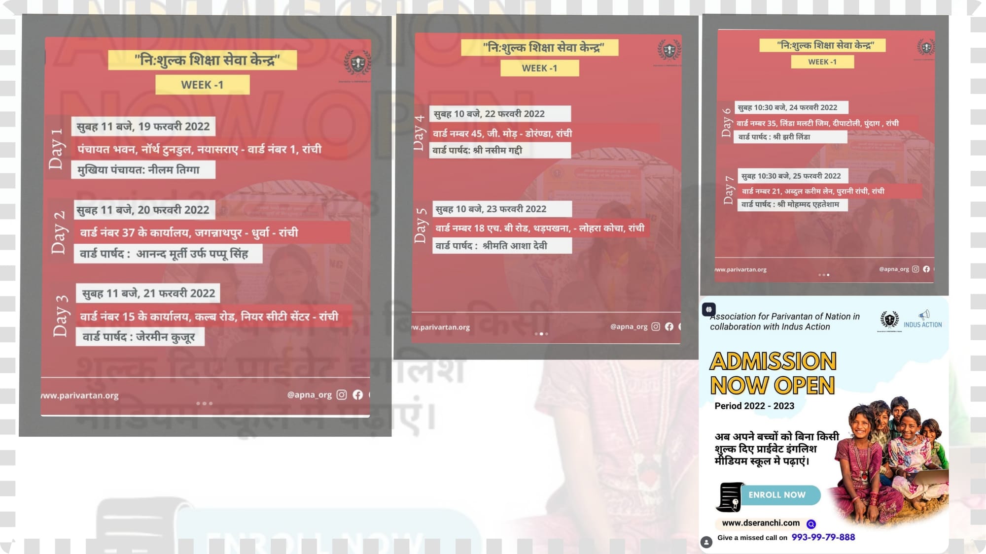 Between 5th January and 15th March 2022, the Association for Parivartan of Nation, in collaboration with Indus Action, launched the second season of the Apna Apke Dwaar campaign under the Project 21A in Ranchi District. The initiative focused on spreading awareness and facilitating admissions under Section 12(1)(c) of the Right to Education Act, 2009, ensuring that “No Vacant Seats Remain.”